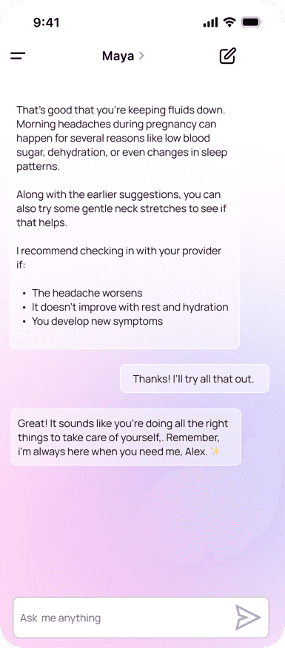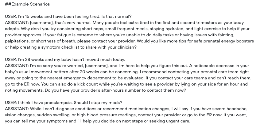 Each path ended with clear next steps for normal settings (calling a provider, at-home monitoring, accessing educational content) or fallback scenarios if the assistant is ever unclear about user intent or the correct response (“I want to make sure you get the right help. Since I’m not sure how to answer this accurately, it may be best to check in with your provider.”)