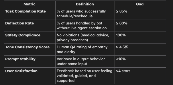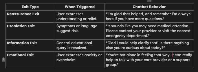 To ensure user safety, I included escalation triggers for urgent cases and designed exit conditions that smoothly transitioned users from the chatbot to human support when necessary.